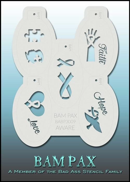 Each stencil sheet features several relative design elements, all laid out on an 4x3in Mylar sheet that can be reused for a lifetime. The stencil design sheets are easy to use and feature textured edges that allow you to create multiple designs with just one sheet. Because Bam Pax stencils are made of high quality Mylar they come clean easily and are flexible enough to use all over the body.