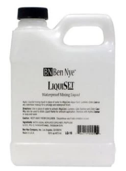 Liquiset by Ben Nye is a mixing liquid that can be used as a sealer, a thinner for liquid makeup to make it flow smoothly through an airbrush, mixed with Metallic powders or in place of water to activate MagiCake paints. Liquiset is fragrance free and recommended when you are seeking a smudge proof finish.