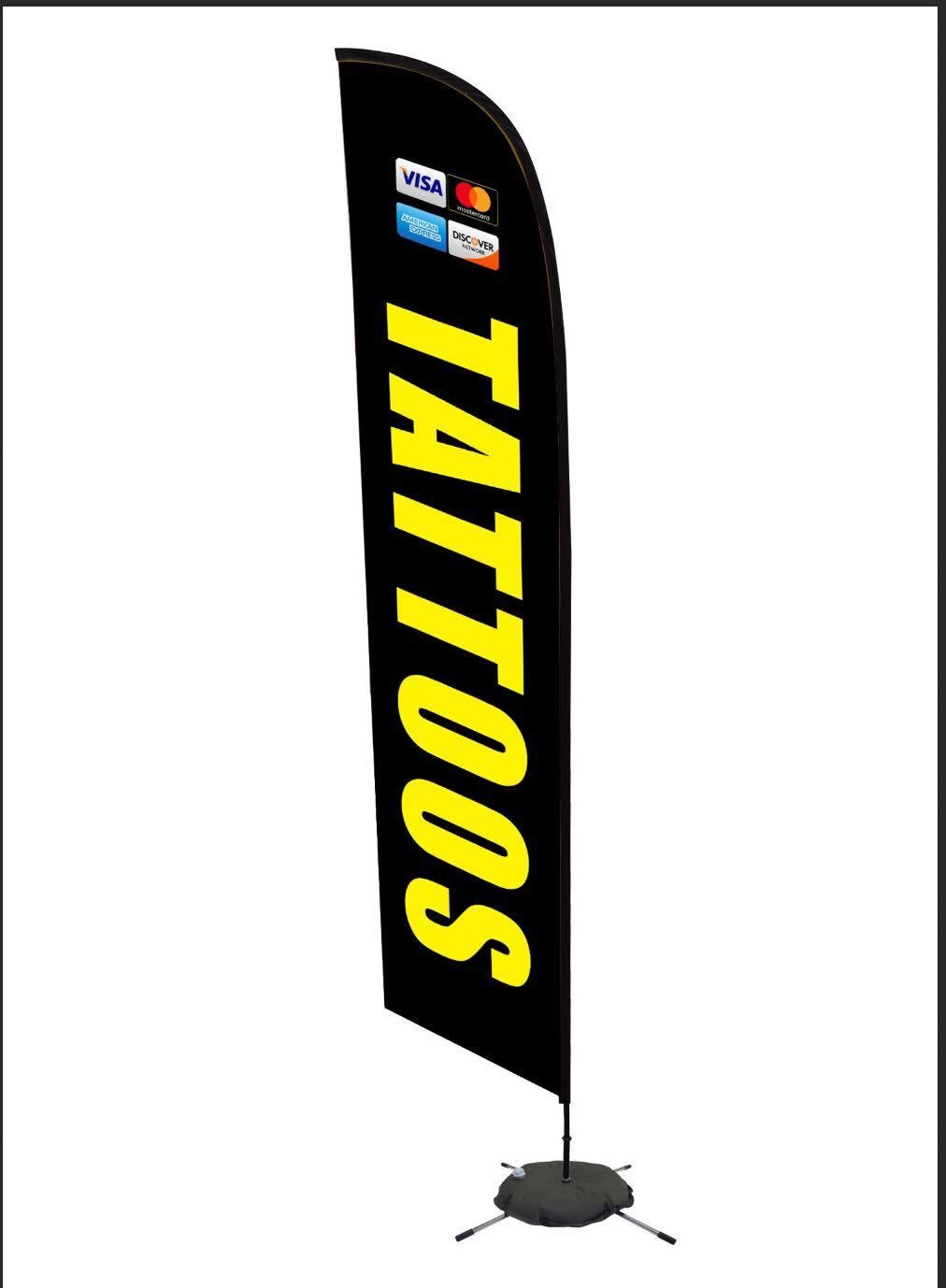 Flags can be purchased via kit which includes flag pole, floor base, grass stake, carrying bag, and printed double sided flag, or just the flag itself.