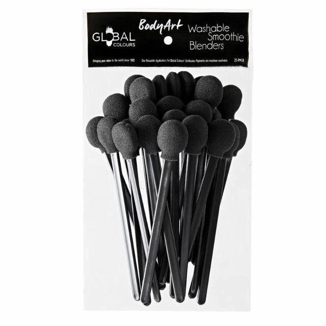 NEW Global Colours BodyArt Washable Smoothie Blenders! Use Smoothie Blenders to cover large areas or eye areas. It is a versatile brush since you can use it to apply powders and water-based makeup evenly. The smoothie blender features rounded edges to do detailed lines or use the flat sides to cover any area with makeup in no time. Available in packs of 25