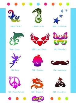 The wonderful Pink Power stencils were created by Silly Farm. These stencils are very versatile as you can use them for face painting with our exclusive Rainbow Cakes and use them as airbrush stencils as well. Contains 12 individual stencils.