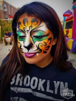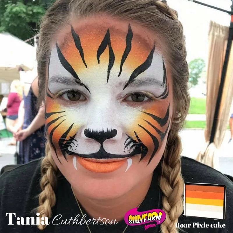 Rainbow cakes are excellent for base work for any design. They are used with a flat brush or sponge to create amazingly blended designs with one stroke. Rainbow Cake color combinations are designed to highlight and low light all with one container. Silly Farm carries over 20 different combinations of rainbow cakes designed to speed up your painting and help you create amazing designs. Rainbow cakes are also ideal for working with Pink Power stencils and Fast Faces kits. Expect 100-500 applications per rainbow cake.