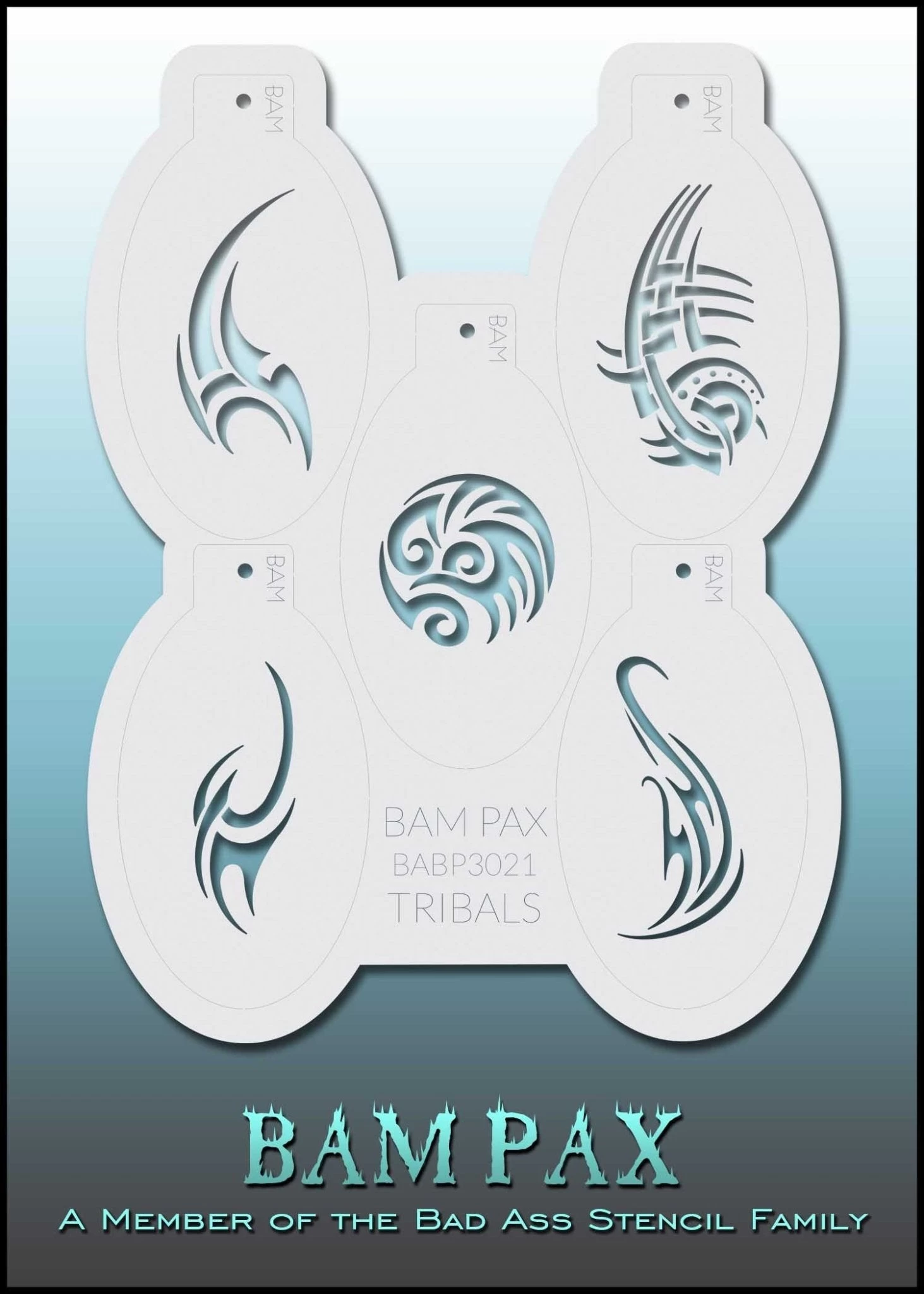 Each stencil sheet features several relative design elements, all laid out on an 4x3in Mylar sheet that can be reused for a lifetime. The stencil design sheets are easy to use and feature textured edges that allow you to create multiple designs with just one sheet. Because Bam Pax stencils are made of high quality Mylar they come clean easily and are flexible enough to use all over the body.