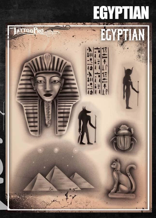 Egyptian features 7 Egyptian themed stencils for creating realistic airbrush tattoos.ย Designed by Wiser Tattoo Pro Stencil kits contain both positive and negative stencil design shapes that are used to create Black & Grey, or full blown color tattoos! Once you start mixing and matching stencils from various kits, you’ll be able to come up with endless designs ideas for quick and easy tattoos!