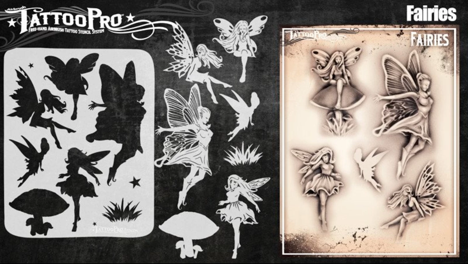 This design sheet features 3 highly detailed 1 large flying fairy, 3 medium fairy stencils, mushroom stencil, and 1 mini flying fairy that can be used to make realistic airbrush tattoos.ย Designed by WiserTattoo Pro Stencil kits contain both positive and negative stencil design shapes that are used to create Black & Grey, or full blown color tattoos! Once you start mixing and matching stencils from various kits, you’ll be able to come up with endless designs ideas for quick and easy tattoos!