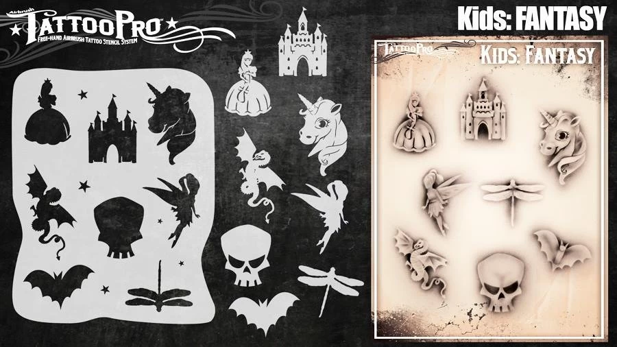 This special edition Kids Stencil Kit contains various kid- sized stencil designs including a princess, castle, unicorn, dragon, fairy, skull, dragon fly, and bat!Tattoo Pro Stencil kits contain both positive and negative stencil design shapes that are used to create Black & Grey, or full blown color tattoos! Once you start mixing and matching stencils from various kits, you’ll be able to come up with endless designs ideas for quick and easy tattoos!