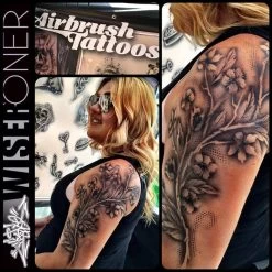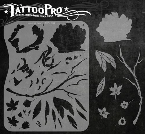 The Flower & Leaf Tattoo Pro Stencil set features one large peony flower (5 steps), 4 small tree flowers, a branch, several leaf shapes and other elements that can be used to make realistic airbrush tattoos.