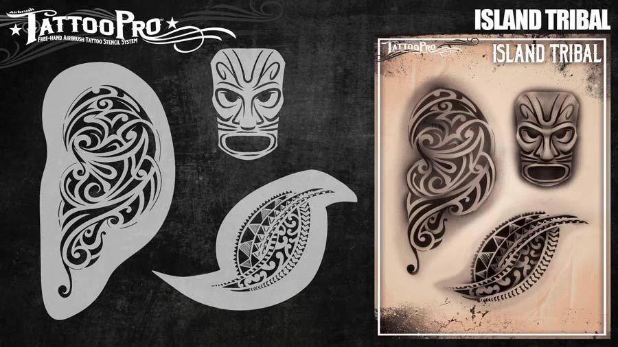 Island tribal features island style tribal designs used to create realistic airbrush tattoos. Designed by Wiser Tattoo Pro Stencil kits contain both positive and negative stencil design shapes that are used to create Black & Grey, or full blown color tattoos! Once you start mixing and matching stencils from various kits, you’ll be able to come up with endless designs ideas for quick and easy tattoos!