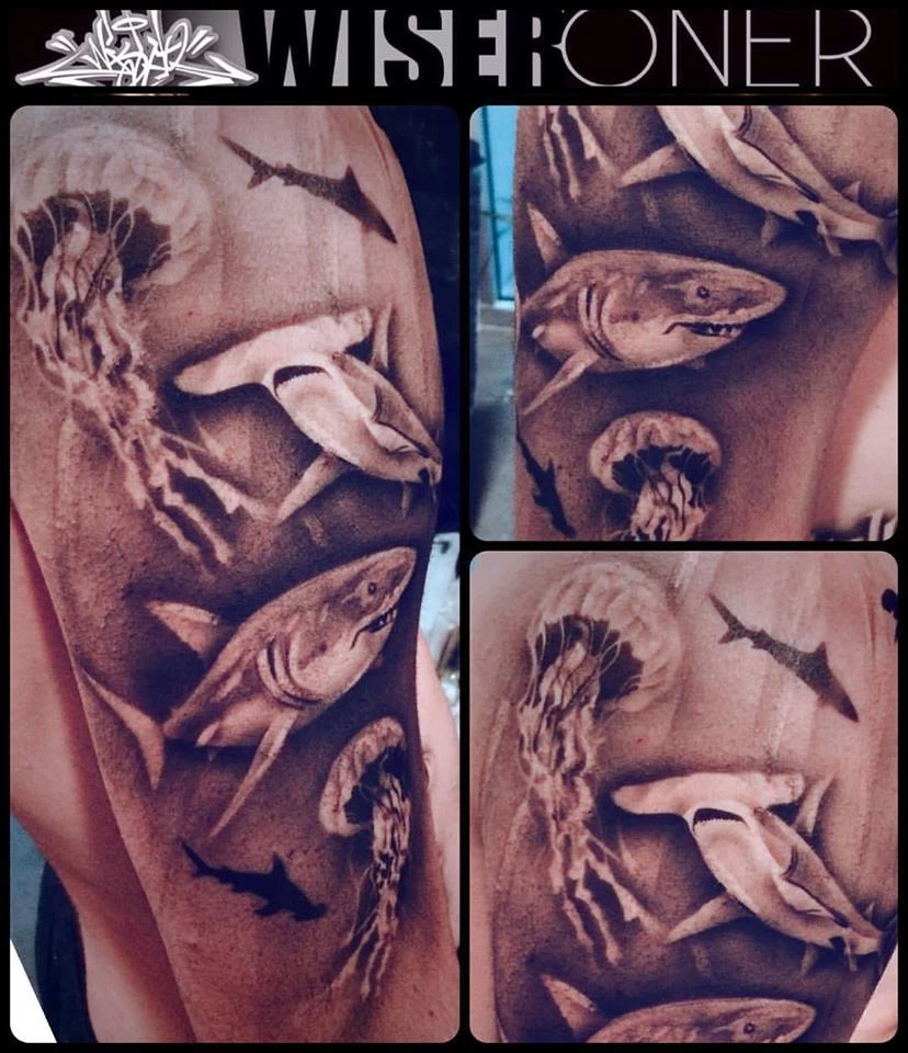 The Shark Attack design sheet features 1 great white shark stencil, 1 hammerhead shark stencil, 2 sizes of jellyfish stencils and other elements used to create realistic airbrush tattoos.